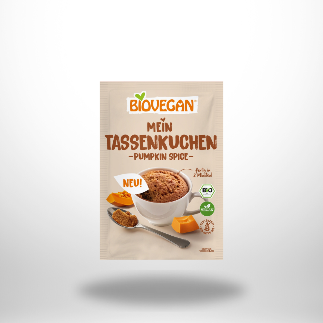 Biovegan Bio Tassenkuchen Pumpkin Spice. Schnell gemacht, natürlich lecker – für gemütliche Augenblicke mit vollem Herbstgeschmack.