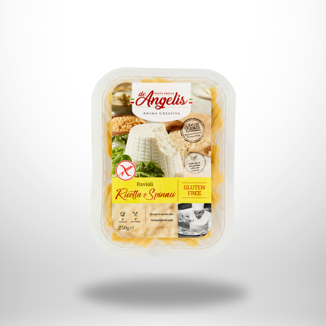 De Angelis frische glutenfreie Ravioli mit Ricotta und Spinat – glutenfreie frische Eiernudeln, gefüllt mit Ricotta und Spinat, speziell für Menschen mit Glutenunverträglichkeit.