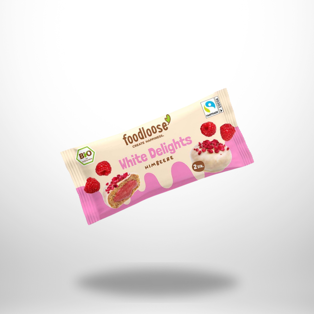 Die White Delights Himbeere von foodloose vereinen zartschmelzende vegane „weiße Schokolade“ mit einer fruchtig-cremigen Himbeerfüllung – ganz ohne raffinierten Zucker, Gluten oder tierische Zutaten.