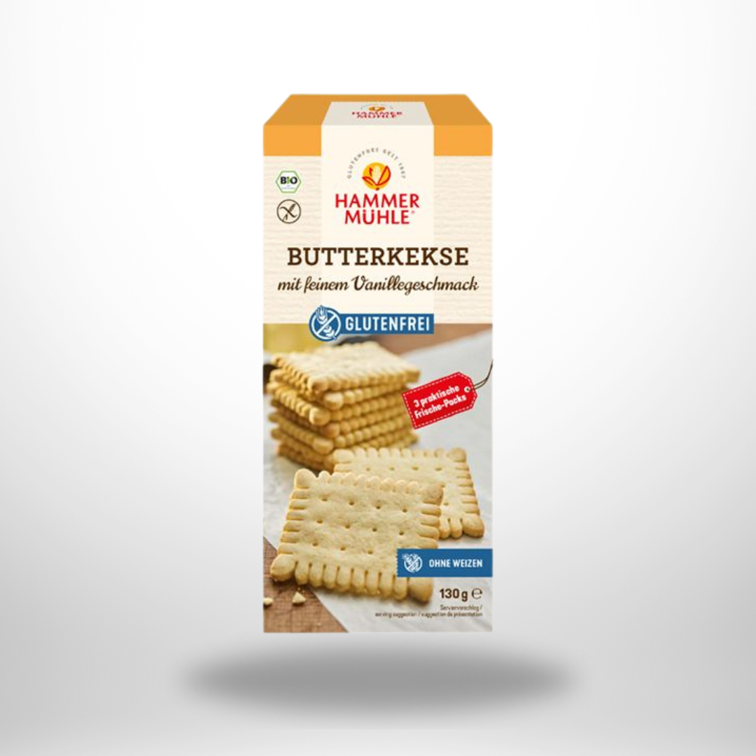 Die Hammermühle Bio Butterkekse sind glutenfreie Kekse, die mit einer besonders zarten und buttrigen Konsistenz überzeugen. Sie sind nach einem klassischen Rezept aus besten Bio-Zutaten hergestellt und bieten einen leicht süßen, vollmundigen Geschmack. Diese Kekse sind ideal zum Tee, als süßer Snack zwischendurch oder zum Kaffeetrinken. Sie kommen ganz ohne künstliche Zusätze aus und sind somit auch eine gute Wahl für alle, die Wert auf natürliche Zutaten legen.