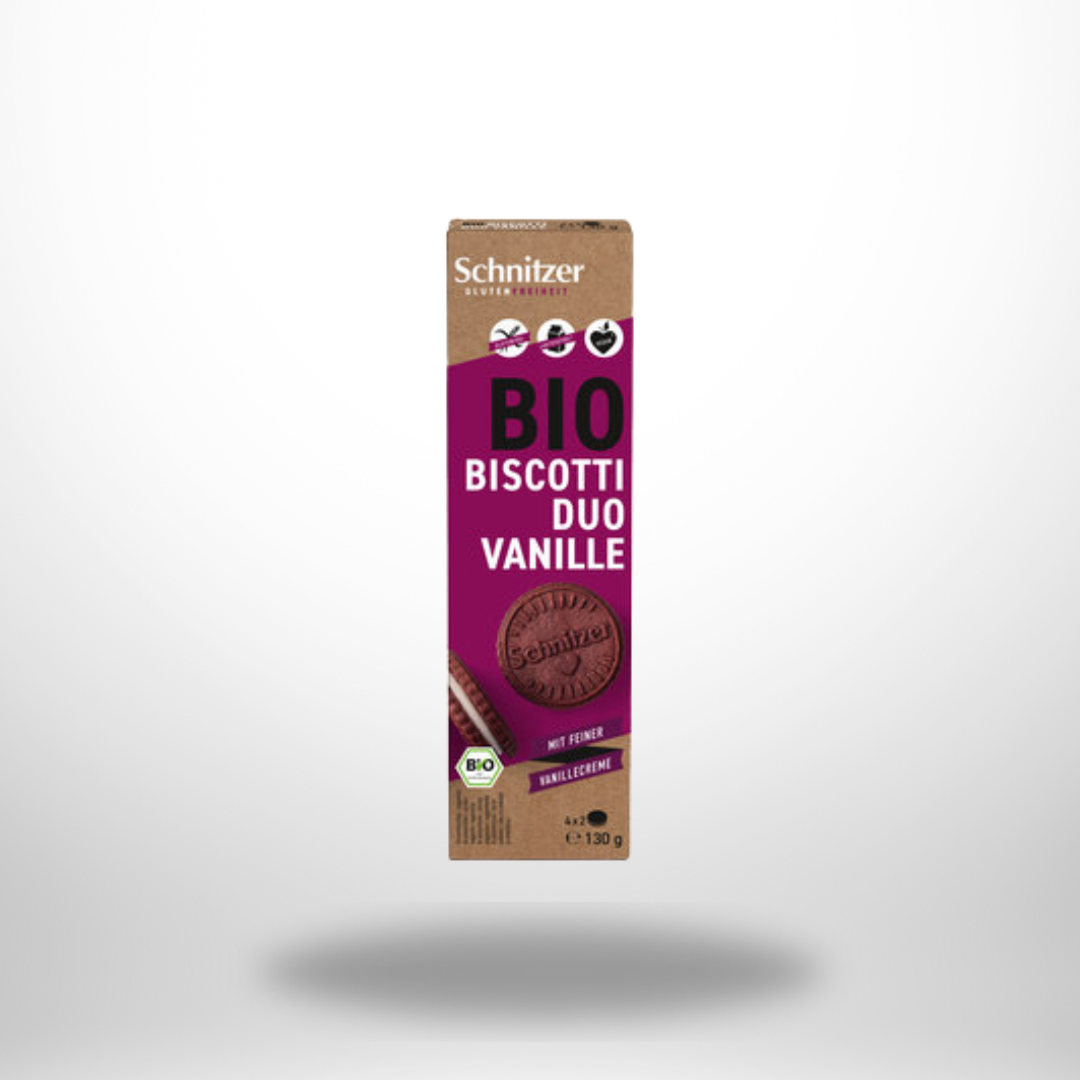 Schnitzer Bio Biscotti Duo Vanille glutenfrei. Genieße knusprige Bio-Qualität mit zarter Vanillenote – aromatisch, traditionell und bewusst lecker.